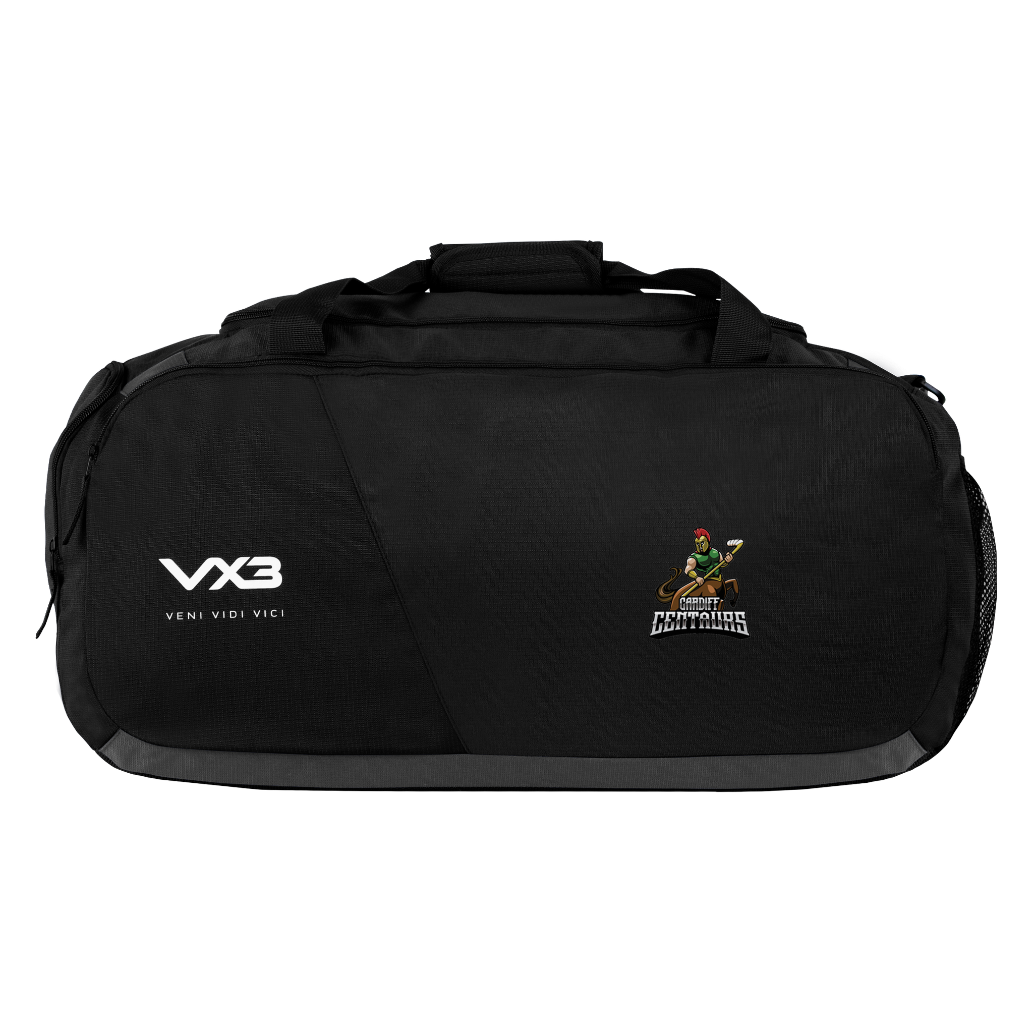 This bag is black and has been finished with the VX3 logo printed on the front pocket in white with the slogan "veni, vidi, vici" underneath.