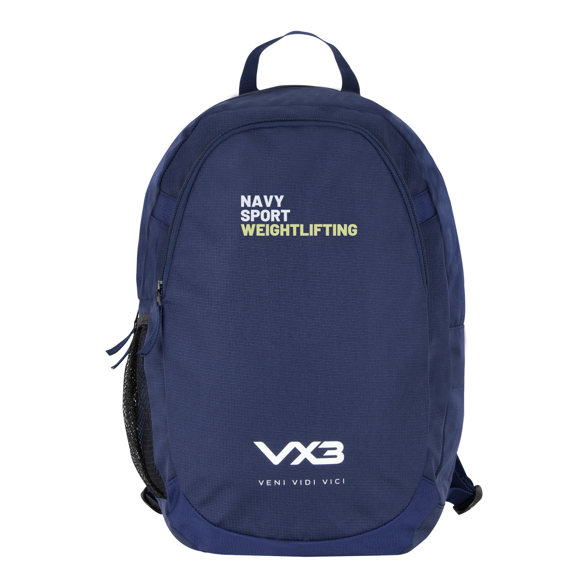 The VX3 logo is printed on the large front pocket at the bottom of the backpack with the slogan 'Veni, Vidi, Vici' underneath. Store your essentials in confidence and keep them safe and dry with the VX3 Performance Backpack, essential for any active person always on the go