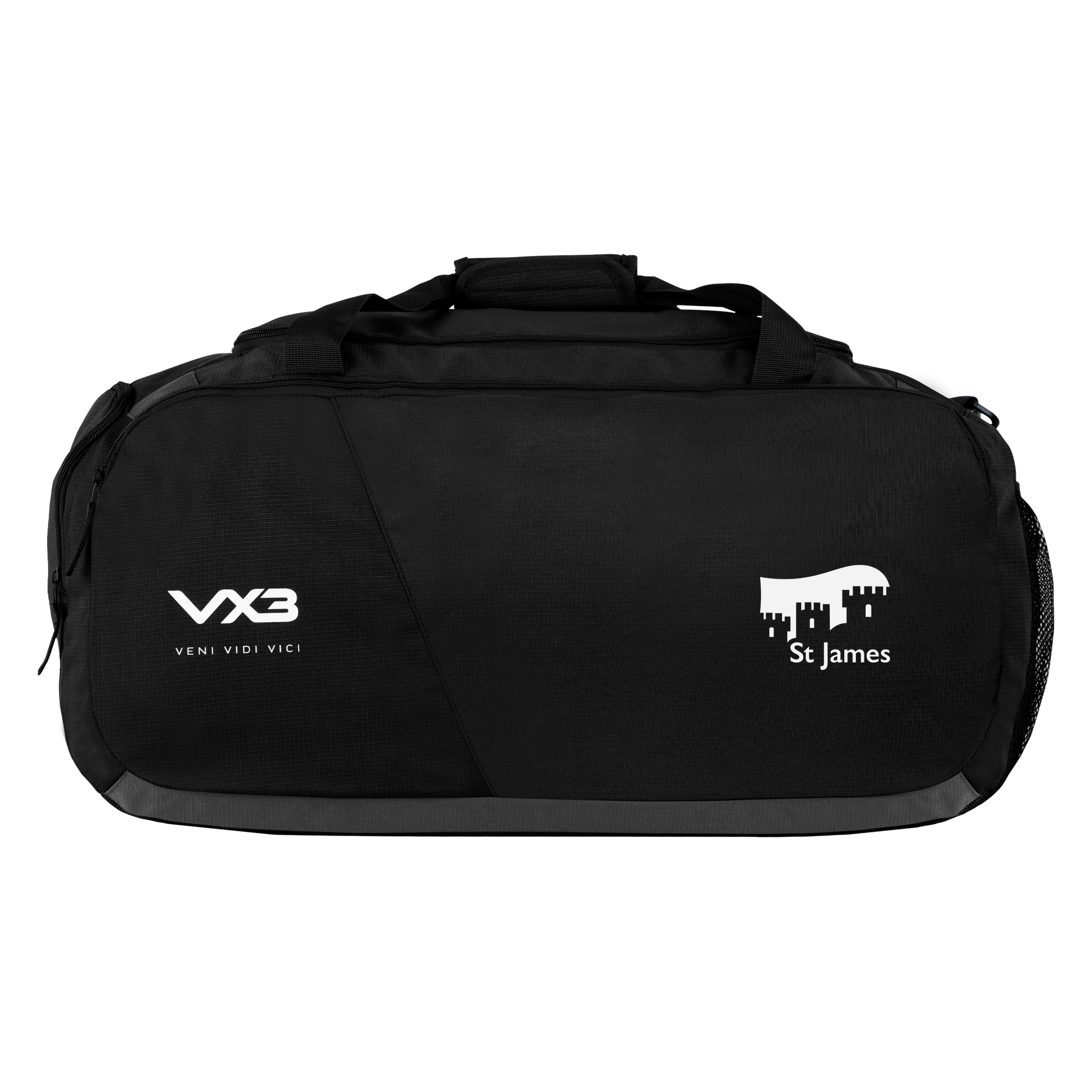 This bag is black and has been finished with the VX3 logo printed on the front pocket in white with the slogan "veni, vidi, vici" underneath.